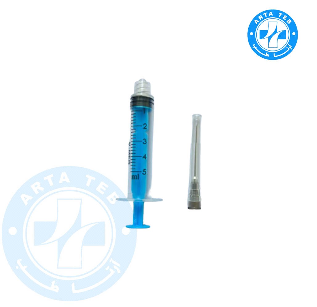 سرنگ 5 سی سی به همراه سرسوزن زیر جلدی G22 رنگ هاب آبی که بطور معمول در تزریقات مورد استفاده قرار می گیرد.