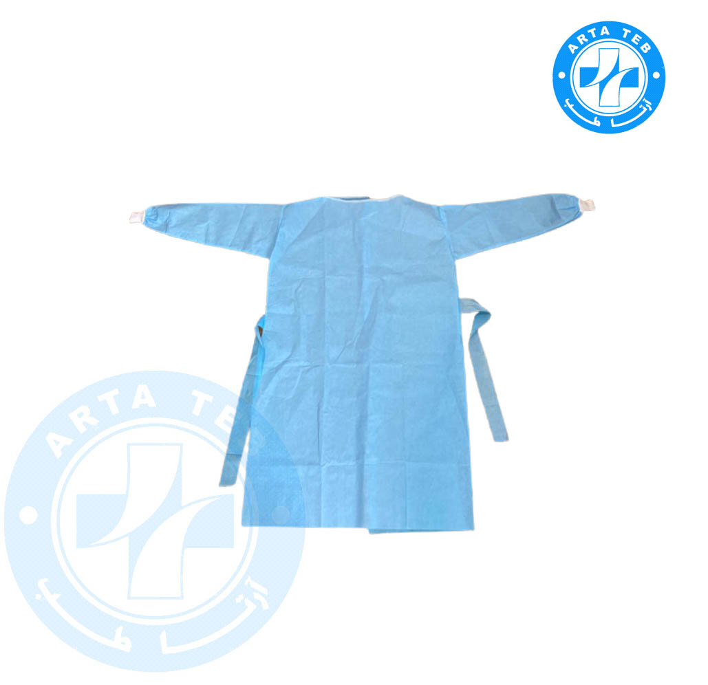 نوع پارچه:آستین و جلو از یک لایه اسپان باند لمینت شده با مواد پلیمری جمعا 50 گرم،پشت گان از پارچه 38 گرم اسپان باند ساده